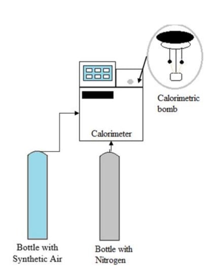The combustion heat value of the obtained torrefied pine wood and sewage sludge was measured using the Parr 6400 calorimeter. The analysis consisted in burning a given sample in an oxygen atmosphere. From the obtained torrefied material, samples weighing about 1 g were weighed and then placed into a tablet. The prepared samples were placed in crucibles and then in a calorimetric bomb to start the measurement. Figure 4 shows a diagram of the apparatus.