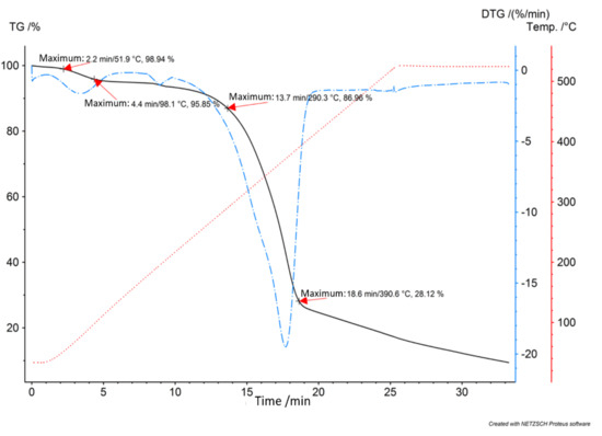 At a heating speed of 5 K/min, the highest weight loss, 84–97%, was recorded at the temperature of 525 °C. The longer the sample remains at this temperature, the smaller the weight loss. At 285 °C, the weight loss was 22–26%. The longer the sample residence time was, the greater the weight loss was recorded. At 325 °C, the weight loss was 55–64%. At the heating speed of 10 K/min at the temperature of 525 °C, the weight losses were significantly lower than in the case of the heating ratio of 5 K/min and amounted to 83–86%. Lower weight losses were also noted at 325 °C, 51–54%. At 285 °C, the lowest weight losses were observed, which amounted to 22–28%. The last heating ratio used during the tests was 20 K/min. At 285 °C, the weight loss was 20–25%. At a temperature of 325 °C, this value increased to 43–54%, and at a temperature of 525 °C from 80–84%.