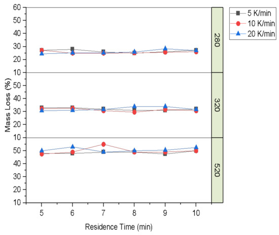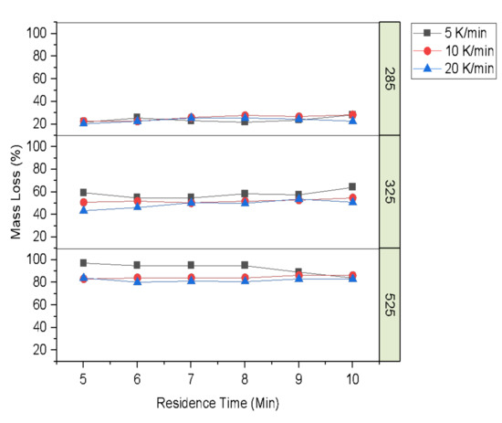 A 37–41% mass loss was found at 350 °C and an 18–24% mass loss was observed at 350 °C. The results show the residence time does not have not as much effect on mass loss as temperature. Desired mass loss, 30%, was reached at 300 °C and further. Over 480 °C, 50% mass loss was observed.