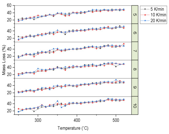 At the maximum temperature of 520 °C, the mass loss was observed in a range of 47–50% with a heating rate of 5 K/min. Minimum and maximum mass losses were found to be 16 and 55% with respect to the lower and higher working temperatures at a 10 K/min rate. Average mass loss during the 10 K/min heating rate was found to be higher than 5 K/min. Minimum and maximum mass losses were found as 17 and 56% at 20 K/min heating rate. In the case of sewage sludge, the lowest weight loss was achieved during the process at a heating speed of 10 K/min, a residence time of 5 min, and a temperature of 280 °C. Figure 8 indicates the sewage sludge mass loss during thermogravimetric analysis at every 10 °C point in the scale 250–520 °C.