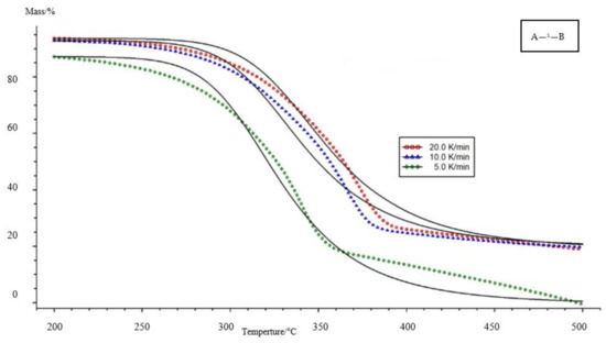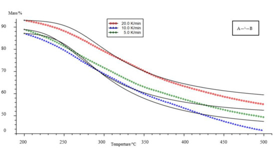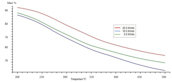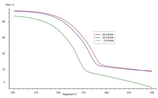 A kinetic study of the pine wood and sewage sludge torrefaction process was performed based on the findings of thermogravimetric measurements with the use of three different heating rates, 5–10–20 K/min. The sample weighed 10 ± 1 mg where temperatures ranging from 200 to 500 °C were used for the kinetic analysis. Figure 9 and Figure 10 show the TG curves of the sewage sludge torrefaction process for three different rates in a temperature range from 200 to 500 °C.
