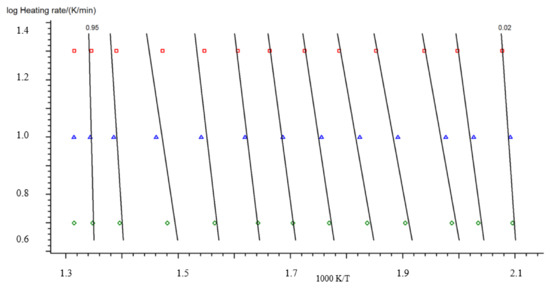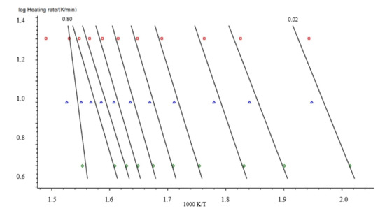 The last method was the Ozawa–Flynn–Wall method, which, as the Friedman method, allows determination of the activation energy value without the necessity of adopting a specific kinetic model [59,60]. It is based on the integral form of the equation: