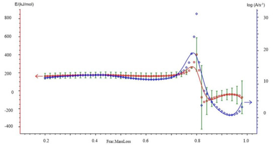 | Fract. Mass Loss | Activation Energy (kJ/mol) | Log (A/s−1) |