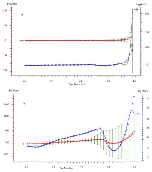 Activation energy (Red color) and pre-exponential coefficient (Blue color) as a function of the conversion degree: (a) X = 0.20–0.98, (b) X = 0.20–0.90 determined by the Ozawa–Flynn–Wall method for sewage sludge. Green color represents the statistical error.