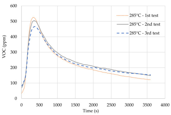 The next stage of the research was to determine the emission of the total volatile organic compounds from the process. The analysis conducted provided data on the course of emission of the total VOC over time, thanks to which the pollutant emission index from the process was calculated. Figure 17 shows the course of emissions of the total VOC over time at 285 °C.
