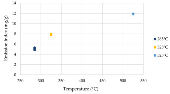 The highest value of the emission index was achieved at the highest temperature of the process, and it was about 12 mg/g. For a temperature of 285 °C the value was about 5 mg/g and for 325 °C it was about 8 mg/g.