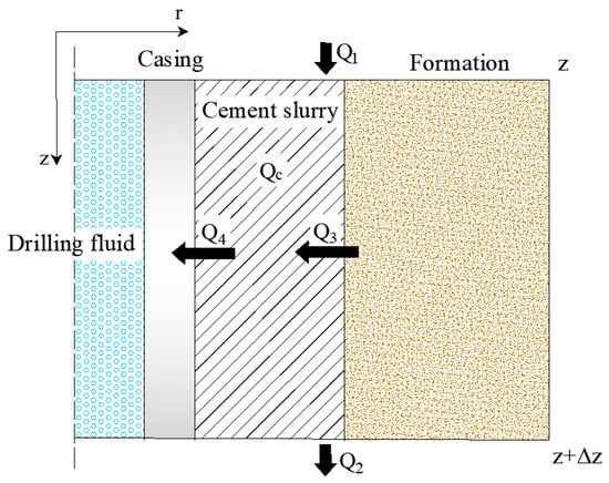 During the WOC stage, after the injection displacement of the cement slurry in place, with the heat exchange of the wellbore, the temperature field in the wellbore changes in real time [23,24]. There are three main influencing factors: heat conduction between cement slurry and drilling fluid in the casing, heat conduction between cement slurry and formation and temperature rise of the cement slurry due to hydration heat. A cylindrical coordinate system is plotted along the downward axial direction of the wellbore, with the origin located at the center of the well head. In the axial direction, the wellbore formation is separated into several control units according to the heat transfer medium and the well structure. Then, any micro unit with length is taken as the research object (Figure 2).