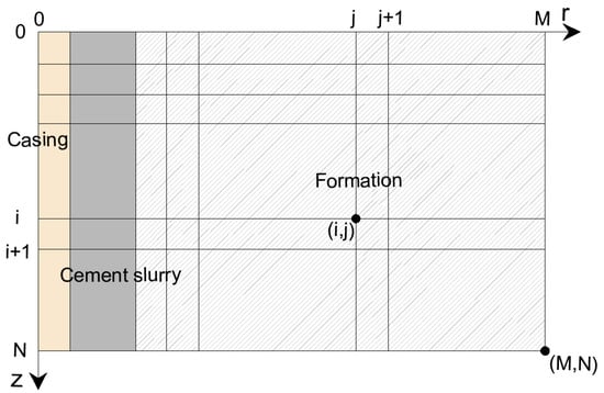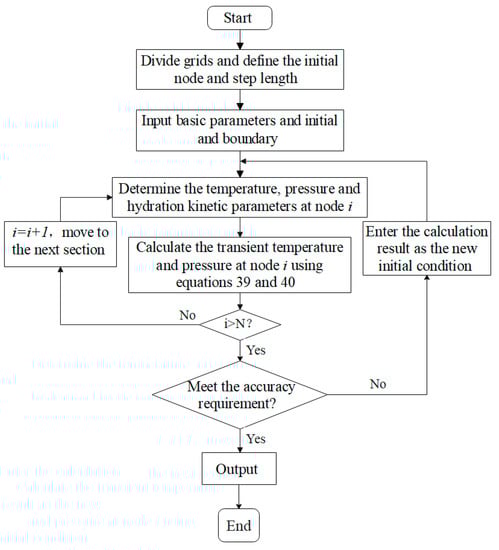 In order to obtain the wellbore temperature and pressure of the HTHP directional well, it is necessary to use the iterative method for calculation. The concrete solving method is as follows: input basic parameters, initial conditions and boundary conditions; mesh radially and axially (Figure 4) and define initial nodes and step sizes; according to the current initial conditions, the temperature, pressure and hydration dynamics parameters at node are calculated and updated; according to the hydration kinetics model, the hydration kinetics parameters of cement slurry at node are calculated; combined with the established temperature field model, the transient temperature of node is calculated; combined with the established pressure field model, the transient pressure of node is calculated; the temperature and pressure calculation results are checked as per the test data to see whether they reach the required accuracy or not. If not, the calculation should be restarted from Step (3); if yes, the calculation is ended, and the calculation of the next time node is started; output the result.