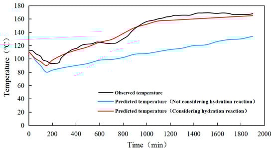 The sensor was placed into well X1 to monitor the temperature of the cement slurry in real time. The monitoring values were compared with the results calculated by the temperature field model in this paper. The comparison result is shown in Figure 6. The comparison result (Figure 6) shows that, without considering the hydration reaction, the maximum error between the predicted results of the model and the monitored values reaches 21.6%. The maximum error between the predicted results and the monitored val-ues is only 5.8% when hydration is taken into account. It shows that the influence of hy-dration reaction on the wellbore temperature field cannot be ignored, and the temperature field model established based on the hydration reaction can simulate the actual wellbore temperature well.