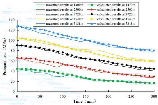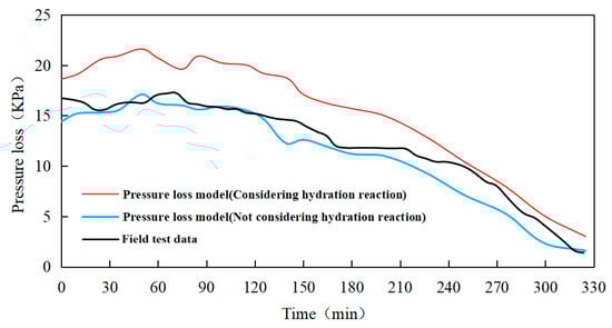 The pressure loss of the cement slurry in the X1 well was monitored in real time by the sensor. The comparison result (Figure 7) between the predicted value calculated by the prediction model and the measured value shows that the pressure loss prediction model based on the hydration reaction dynamics of cement slurry can better simulate the actual pressure loss of cement slurry and meet the demand of anti-channeling.