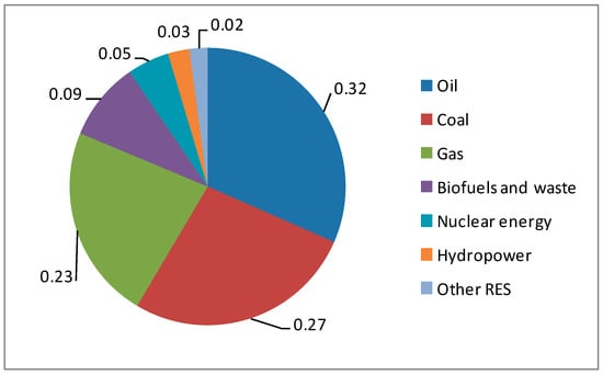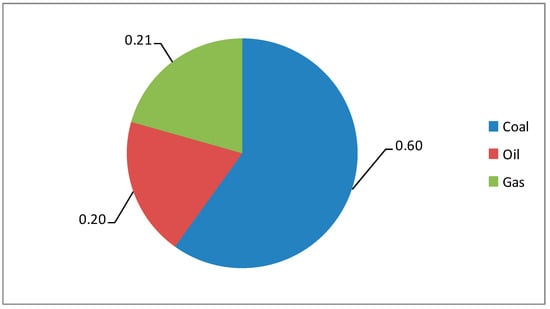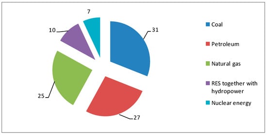 With regard to the energy industry, different trends can be noticed between the European market and the world []. While gas energy will record growth in both markets, the potential of coal energy will be characterized by a significant increase globally, and by a decrease in Europe. The share of coal-based energy will decline in different regions of the world for different reasons—in North America, due to the possibility of extracting rich shale gas deposits, and in Europe after 2020, as a result the entry into force of new legislation on emission levels. This also results from the exhaustion of hard coal resources in some developed countries of Western Europe. Power generation levels from all three of the main fuels are expected to be higher and, in addition, projections indicate that coal will become the dominant fuel. Currently, it constitutes almost 30% of the power of existing installations, and in 2030 it may reach the level of approximately 35% of the amount of energy produced and globally will again become the main energy resource []. Gas is also expected to catch up quickly and gain even more importance. The current level of use of various energy sources is shown in Figure 1.