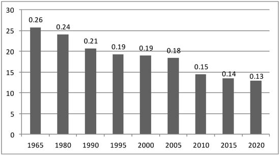 Analyzing the share of energy consumption by Europe in the global balance, one can see a sharp decline in the share of EU countries in world consumption, from 26% in 1965 to less than 13% in 2018 []. The economies of the rich countries of Western Europe are saturated, and the countries of Central and Eastern Europe are not making up for backlog at the same pace as the developing countries of the world, especially Asia. In addition, there was a pandemic crisis and we are now dealing with stagnation in the economies of the EU Member States. Figure 2 shows the declining share of Europe in global energy consumption.