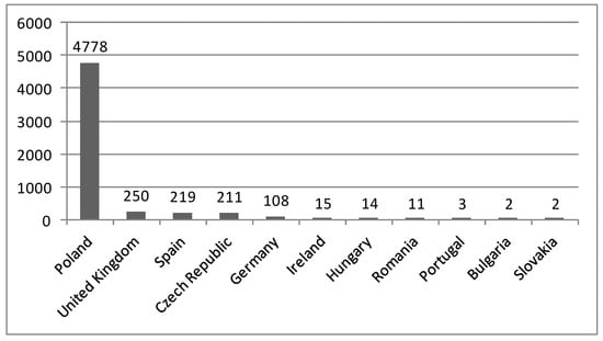 Europe is an ever-smaller player in the global energy market. This is also visible in the analysis of the share in the global use of the three main energy sources that best indicate energy trends in Europe. The percentage of crude oil consumption decreased from 29% in the 1970s to 14% in 2018 []. The share of gas, after a sharp increase until the early 1980s, when it was 19%, had a long period of stability, only to drop to 12% in 2018 after 2005. However, the largest decrease was recorded by coal, as in 1965 Europe consumed 36% global balance sheet and in 2018 less than 8% []. This is a persistent trend that shows the need for energy consumption in other, rapidly developing regions of the world, as well as stagnant economies and energy problems in EU countries. When analyzing hard coal resources in the EU countries, it can be said that the era of hard coal mining in the absence of the discovery of new deposits naturally ended as a result of resource depletion. Poland should only be omitted, which currently has approximately 85% of all hard coal resources among the European Union countries (Figure 3).