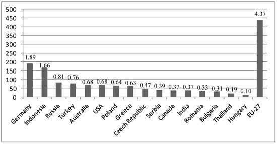 The strategy of energy policy in the global and EU context must be based on comprehensive detailed analyzes. For example, conclusions for the coal industry should be drawn from the analysis of all types of coal currently available because often in the literature on the subject you can find analyses based solely on hard coal resources, which may cause wrong strategic decisions in the energy policy (hard coal contains 75–97% carbon element and a calorific value between 17 and 30 MJ/kg. For comparison, the calorific value of pure carbon is approximately 33.2 MJ/kg). The best examples are the EU Member States, where the energy and climate policy, at least in theory confirmed by EU legal acts, aims to limit coal as an energy resource due to excessive carbon dioxide emissions. On the other hand, practice, i.e., statistical data, shows something completely different, and despite the exhaustion of hard coal resources, coal consumption continues to increase. In addition, forecasts indicate that, as in the world, also in EU countries, coal consumption will grow, despite the policy of limiting so-called “Dirty” energy, i.e., energy that emits a significant number of greenhouse gases []. Germany is an excellent example of this issue. The country that is most responsible for the direction of the contemporary EU climate and energy policy, due to the influence of the Green party, is at the same time the largest coal producer in Europe, and in terms of lignite mining (lignite has a carbon content of 62–75% and a calorific value between 7.5 and 21 MJ/kg, but, for example, drying the raw coal can bring this value up to 29 MJ/kg) is the largest in the world (Figure 4). Additionally, investments in the construction of another six lignite mines has commenced, which will further strengthen Germany as a world leader []. Therefore, in the coming years, lignite mining in Germany will exceed 200 million tons per year.