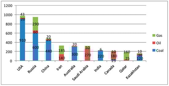 Therefore, action strategies in the EU countries should be developed taking into account the investments carried out in practice, including in Germany, which differ from the arrangements for energy policy. In addition, Germany, which in terms of value has the largest share of carbon dioxide emissions among EU countries, generates almost 50% of electricity from coal, including over 30% from less efficient lignite []. For the economy, this will act as compensation for the high costs of green energy and ensure the security of electricity supply in the event of fluctuations in RES production []. Therefore, a rational energy policy has been implemented, which is contrary to the decisions of the EU. Problems in the EU energy and climate policy result from contradictory goals and failure to adhere to the developed policy and the lack of rich deposits of the main energy sources. Figure 5 shows the top 10 richest countries in the world with the three main energy resources.