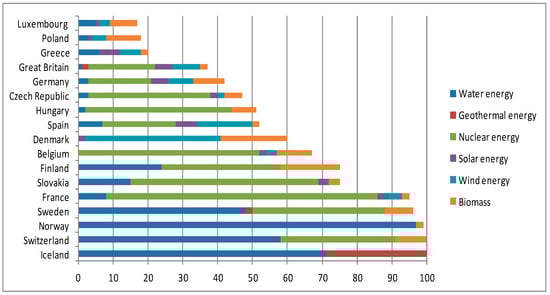 Due to the dependence of European countries on external supplies, the current energy strategy is aimed at gaining access to the entire energy market thanks to infrastructure investments and greater use of own resources thanks to technological innovations. Figure 7 shows the current share of low-emission energy sources in electricity production in selected European Union countries.