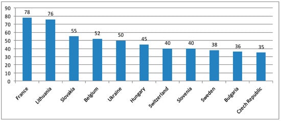 The above-mentioned arguments, as well as the need to ensure the security of energy supplies for the economy, meant that the “3 × 20” plan will not be implemented so rigorously []—certainly not in the short term, until 2030. Additionally, plans such as reducing energy consumption by 20% may turn out to be a pipe dream even in the time horizon up to 2050. Demand is certainly growing, and energy efficiency does not provide the ambitious results envisaged in the EU plans. Commissioner Oettinger said that European industry must have cheap energy to be competitive. RES are costly, unstable and require large initial investments in energy systems. Therefore, while reducing or depleting coal resources, many EU countries must to develop nuclear energy, which is already the dominant source in several countries, as shown in Figure 10.