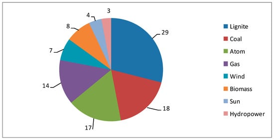 Everything points to Germany’s return to nuclear energy, which was to be abandoned by 2022, because with the development of renewable energy, the gas energy market is growing because electricity from wind and sun is not produced in a continuous and stable manner; therefore, gas-fired power plants that can be quickly turned on and off are necessary []. In Germany, the wind blows on average only 20% of the time, so the construction of windmills is really the construction of gas power plants and more efficient use of the Nordstream, and therefore greater dependence on Russian supplies. The construction of further coal-fired power plants will result in over 50% share of coal in the energy mix for electricity production, the structure of which is shown in Figure 11.