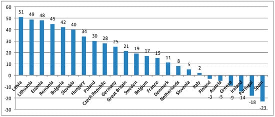 EU policy in relation to coal and nuclear energy is not clear because the European Union did not adopt specific values to be achieved for certain Member States. The instruments of energy and climate policy (taxes, trading in CO2 emissions) have a negative impact on the competitiveness of obtaining energy from these sources []. By contrast, the costly subsidy of renewable energy consumes billions of subsidies that are making EU countries indebted. High prices of electricity from RES burden end consumers and directly reduce the competitiveness of EU economies []. This is confirmed by current events on the world stage and the statements of EU heads of government. Consequently, a return to traditional energy sources is forecast and Europe is projected to continue to depend on external supplies, especially as climate charges are reduced. Figure 12 shows the implementation status of greenhouse gas reduction plans by 2030 for individual EU Member States.