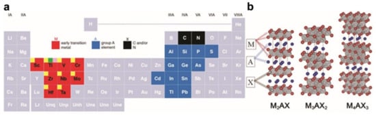 (a) The elements of the periodic table for MAX phases. (b) Structures of M2AX, M3AX2, and M4AX3 phases [41].