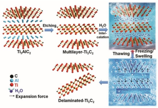 - Naguib, M.; Mashtalir, O.; Carle, J.; Presser, V.; Lu, J.; Hultman, L.; Gogotsi, Y.; Barsoum, M.W. Two-dimensional transition metal carbides. ACS Nano 2012, 6, 1322–1331. [Google Scholar] [CrossRef]