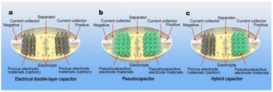 Supercapacitors (SCs) are kinds of energy storage devices that contain negative electrodes, positive electrodes, separators, and electrolytes [58]. Normally, SCs possess significant advantages of fast charge/discharge rates, high power density, and long cycle stability due to their special energy storage mechanism. In general, SCs can be classified as electrical double-layer capacitance (EDLC), pseudocapacitors, and hybrid supercapacitors [59]. The EDLC mechanism is an electro-physical storage process that involves the charge accumulation and reversible adsorption/desorption of electrolyte ions on the interface between electrodes and electrolytes [60]. The commonly used electrode materials for EDLC are mainly porous carbonaceous materials. Pseudocapacitors, also called redox capacitors, store charges via the electrochemical processes of surface redox reactions with electron gain/loss or pseudocapacitive intercalation [61]. Hybrid supercapacitors (HSC) integrate EDLC-type and redox-type electrodes in the device and display an electrophysical and electrochemical mixed mechanism [62]. The schematic illustrations of different SCs are shown in Figure 3.