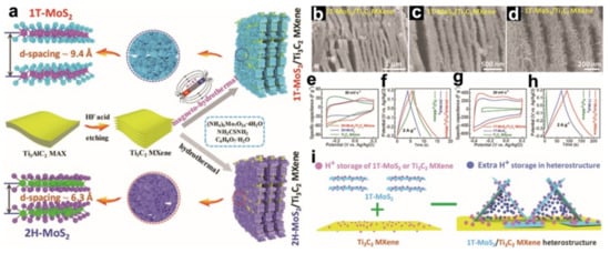 MXene-based composites. In order to solve the restacking problem mentioned above and further enhance the charge storage performance of MXenes, Sun and co-workers adopted the Ti3C2 MXene and 1T-MoS2 to construct a 3D interpenetrated architecture of 2D/2D 1T-MoS2/Ti3C2 heterostructure by the magneto-hydrothermal method. Enhanced electrochemical performances are observed from this material, which result from the synergistically interplayed effect of the unique 3D interpenetrated heterogeneous networks (e.g., enlarged ion storage space between Ti3C2 and 1T-MoS2 for storing more electrolyte ions, boosted electron conductivity provided by MXene, and more active sites for redox reaction offered from 1T-MoS2 phase). As a result, the heterogeneous material exhibits a specific capacitance of 386.7 F g−1 at 1 A g−1 in a potential window of −0.3–0.2 V with outstanding rate performances (a high capacitance of 207.3 F g−1 at 50 A g−1). They also reported that the total capacitance of this material comes from three parts, containing contributions originating from 1T-MoS2, MXene, and extra H+ storage in the interpenetrated space within the 3D heterostructure (Figure 4), while the 1T-MoS2/MXene sample without heterostructure lacks the extra H+ storage capacitance, indicating the existence of a strong coupled effect between composition and structure for the 3D heterostructure. Furthermore, a symmetric SC based on the as-design material displayed a high areal capacitance of 347 mF cm−2 at 2 mA cm−2 with excellent cycle stability (91.1% capacitance retention after 20,000 cycles) (Figure 4) [66].