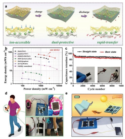 - Wang, Y.; Wang, X.; Li, X.; Liu, R.; Bai, Y.; Xiao, H.; Liu, Y.; Yuan, G. Intercalating ultrathin MoO3 nanobelts into MXene film with ultrahigh volumetric capacitance and excellent deformation for high-energy-density devices. Nano-Micro Lett. 2020, 12, 115. [Google Scholar] [CrossRef] [PubMed]