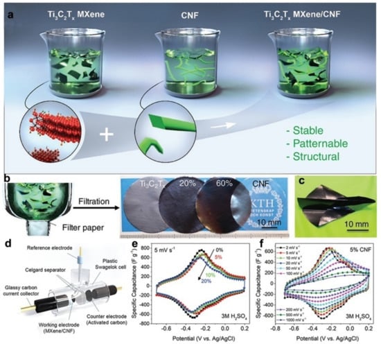 - Tian, W.; Vahid Mohammadi, A.; Reid, M.S.; Wang, Z.; Ouyang, L.; Erlandsson, J.; Pettersson, T.; Wagberg, L.; Beidaghi, M.; Hamedi, M.M. Multifunctional nanocomposites with high strength and capacitance using 2D MXene and 1D nanocellulose. Adv. Mater. 2019, 31, 1902977. [Google Scholar] [CrossRef] [PubMed] [Green Version]