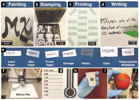 (a–e) Written MXene on various substrates via various ways, (f,g) using the automatic drawing tool of AxiDraw for patterning by using the Ti3C2 inks, (h,i) versatile patterning using AxiDraw, and (j) a demonstration of MXene inks drawn on an apple [81].