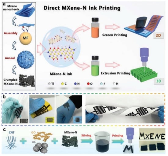 - Yu, L.; Fan, Z.; Shao, Y.; Tian, Z.; Sun, J.; Liu, Z. Versatile N-doped MXene ink for printed electrochemical energy storage application. Adv. Energy Mater. 2019, 9, 1901839. [Google Scholar] [CrossRef]