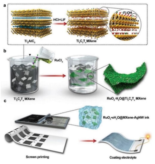 - Li, H.; Li, X.; Liang, J.; Chen, Y. Hydrous RuO2-decorated MXene coordinating with silver nanowire inks enabling fully printed micro-supercapacitors with extraordinary volumetric performance. Adv. Energy Mater. 2019, 9, 1803987. [Google Scholar] [CrossRef]