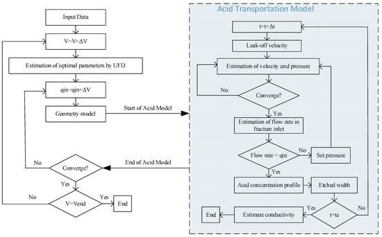 Figure 1 illustrates the workflow of the proposed method. First, the initial data listed in Table 1 are entered into the model. Data include formation and rock properties, acid properties, and parameters of the UFD method. Then, optimal fracture geometry parameters for a specific volume are calculated using the UFD method. In the next step, an initial guess for the injected flow rate is made. After that, the flow rate is iterated to achieve the optimal fracture geometry parameters. As reported in previous studies, the fracture propagation and acid transport models are simulated for a specific flow rate [13,27]. The details of the fracture propagation and acid transport models are given in Section 2.3 and Section 2.4, respectively. The condition of convergence is to minimize the Equation (1). It should be noted that an optimal flow rate is estimated for any specific acid volume. This process continues until the final acid volume is reached.