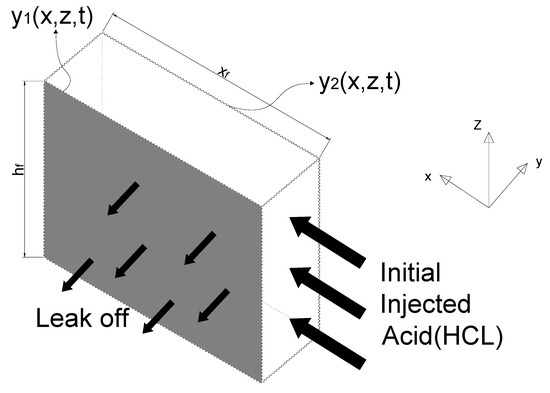 During acid fracturing, the fracture’s initial geometry is formed by a mechanical process similar to proppant fracturing. The geometry of the fracturing propagation model is based on the PKN method, and fracture half-length is determined as follows [27]: