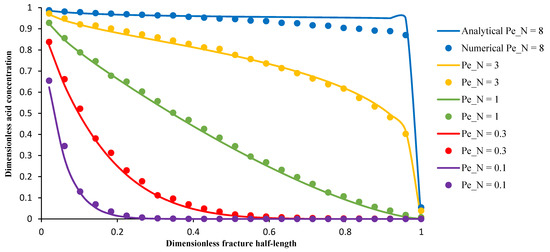 where, values , , , and are given in Table 2 [4]. The dimensionless acid concentration versus dimensionless fracture half-length was estimated at different Peclet numbers by the numerical and analytical solutions (Figure 3).