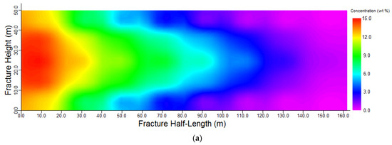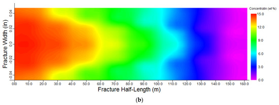 Simulated acid concentration within the fracture domain for a flow rate of 10 bbl/min and 400 bbl acid volume. (a) fracture half-length vs. height (b) fracture half-length vs. width.