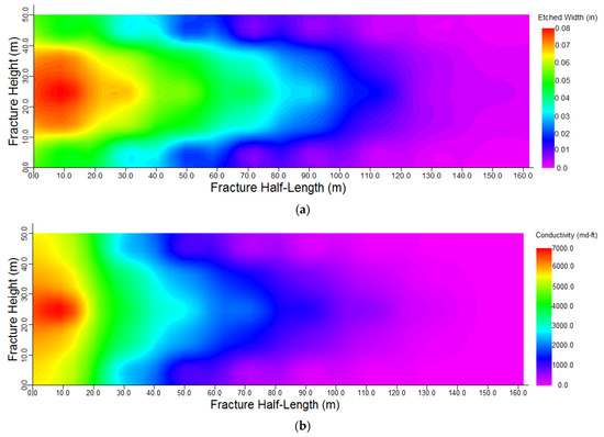 Acid-etched width (a) and fracture conductivity (b) distribution in the fracture domain for a flow rate of 10 bbl/min and 400 bbl acid volume.