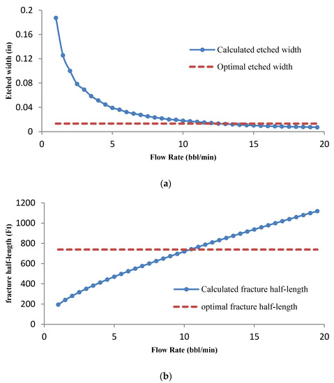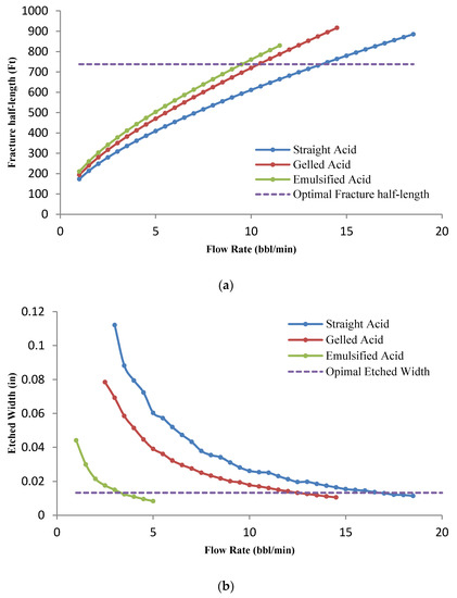 The average acid-etched width (a) and fracture half-length (b) versus injection flow rate.