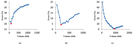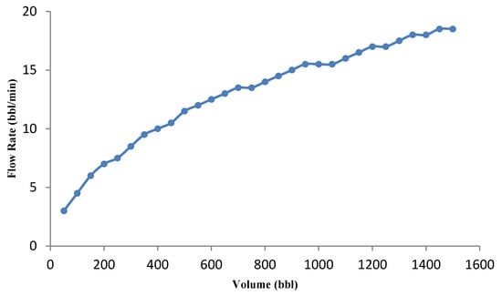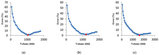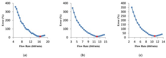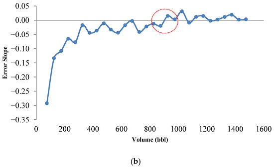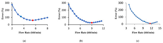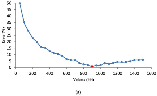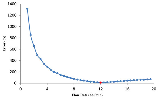 Acid volume significantly influences the acid fracturing treatment results. Since the acid volume change causes the optimal fracture geometry parameters and the optimal flow rate to change; in this study, the volume was changed for a specific range, and the minimum and maximum acid volumes, and the volume difference were selected as 50, 1500, and 50 bbl, respectively. The calculations continue until the last volume, and the minimum error is recorded in a specific volume for the following calculations. The minimum error changes versus acid volume graph are presented in Figure 8a. The calculated error value decreases as the volume increases and after reaching the minimum error value, the graph slope increases. The error-derived curve versus volume was also used to analyze the accuracy of results. According to Figure 8b, the error derivative starts with a steep slope and then slowly increases. The error derivative within the red circle in Figure 8b strikes the zero line for the first time. This collision is equivalent to the minimum error (red dot in Figure 8a). The volume calculated at this point is 900 bbl. Selecting a larger volume not only increases the treatment risk, operating costs will also rise significantly. The optimal flow rate for each acid volume was calculated, and the results are shown in Figure 9. If a high acid volume is selected, optimal fracture half-length and average fracture width estimated by the UFD method increase. These conditions can only be achieved at a high flow rate. In general, it has been proven that the optimal flow rate increases with the increase in acid volume [22]. For instance, the flow rate for 900 selected bbl is 15 bbl/min.