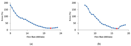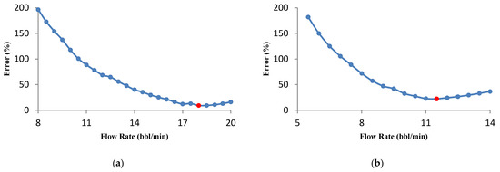 The formation permeability has a significant influence on the optimal fracture geometry parameters calculated by the UFD method. The effect of permeability for two samples with values of 0.1 and 0.001 md on the injection flow rate was investigated. The acid volume considered is 500 bbl. The flow rate–error graph for two samples is presented in Figure 10. It is desirable for low formation permeability to achieve a fracture with a high fracture half-length and small average fracture width. A higher flow rate will be required for the acid to penetrate deep into the fracture. The optimal flow rates for permeabilities of 0.001 and 0.1 md were calculated to be 18 and 11.5 bbl/min, respectively. To investigate the influence of the volume on the optimization results, the acid volume was increased to 1000 bbl, the calculations were repeated and the results are shown in Figure 11. If the volume of injected acid increases, the flow rate should be increased to approach the fracture geometry optimal condition. Therefore, the optimal flow rate increases for both samples. However, when permeability is 0.001 md, a higher flow rate is needed. The optimal flow rates for the permeability of 0.001 and 0.1 md were 21 and 16.5 bbl/min, respectively.