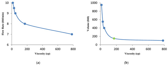 The impact of fluid viscosity on the of flow rate (a) and acid volume (b) for a 540 bbl acid volume.