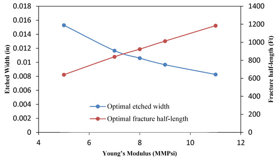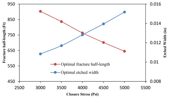 where is estimated fracture half-length for a specific flow rate, is optimal fracture half-length, is estimated average acid-etched width for a specific flow rate and is the optimal fracture width.