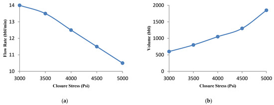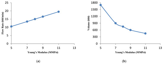 The viscosity of the injected fluid is one of the controllable parameters in hydraulic fracturing. Proper selection of this parameter can reduce costs and improve the results of hydraulic fracturing. The impact of different viscosities on injection flow rate is illustrated in Figure 12a. It should be noted that the viscosity refers to the fracture fluid viscosity as presented in Table 3 [37]. For a low viscosity fluid (14 cp), higher flow rates (about 14 bbl/min) will be required to achieve optimization purposes. In contrast, for high viscosity fluid, a lower flow rate is needed. Fluid leak-off can be controlled in high viscosity values. Therefore, in such conditions, the required fluid flow rate is reduced.