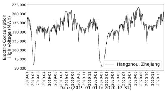 The basic information of the electricity consumption dataset is summarized in Table 1. The dataset contains daily total high-voltage (higher than 10 kV, mainly industrial use) electricity energy consumption of 87 administrative regions (districts) in the Zhejiang province. The record length of most of the data is from January 2019 to December 2020. Based on the data of daily COVID-19 cases of China [31], the daily number of new cases peaked around early February of 2020 and almost vanished around mid-March of 2020. Therefore, the electricity consumption dataset covers the pre-COVID-19, in-COVID-19, and post-COVID-19 periods of China. Figure 1 shows one sample of the data, the electricity consumption of Hangzhou (the capital city of the Zhejiang province). It is shown that, before the outbreak of COVID-19, the electricity consumption was stable except for the Chinese New Year holiday period (February of 2019); after the outbreak of COVID-19 in Wuhan in late January of 2020, the electricity consumption remained low for a few weeks before it climbed up to the level similar to 2019. The trend of the data is as expected.