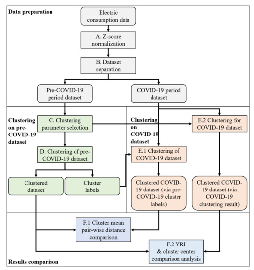 - Results comparison: This step performs a comparison analysis on the clustering results obtained from the datasets in two different periods, including the pre-COVID-19 period and COVID-19 period. The analysis reveals the impact of the pandemic on the electricity consumption pattern.