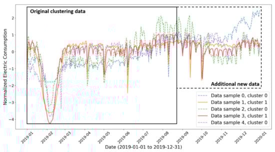The above three metrics are standard ones that only evaluate the performance based on a fixed dataset. However, this study deals with time series electricity consumption data, which is time-dependent and may change rapidly over time. Figure 3 shows a schematic example of clustering with an additional new dataset. Originally, conventional K-means clustering can be performed based on the “original clustering data”. For example, the clustering labels are [0, 1, 0, 1, 0], meaning samples 0, 2, and 4 are in cluster 0, and samples 1 and 3 are in cluster 1 (each sample represents a region). Since the dataset is time-series electric energy consumption, additional data could be obtained for each sample, i.e., “additional new data”, as shown in Figure 3. For the additional new data, the previous clustering labels were directly applied without performing K-means clustering again. If we assume there is no fundamental change in the electricity consumption pattern of the regions, the clustering result on the “additional new data” should be satisfactory, i.e., cluster members are closed to each other. However, in this example, data sample 0 in “additional new data” is far from its cluster members (data sample 2 and data sample 4). This means the clustering model used in this example is not suitable. We used two additional metrics to quantitively evaluate a clustering model or clustering results in terms of time-series data. The first one is named “delta inner-cluster distance”.