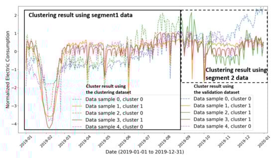 Ideally, for time-series data, if all data samples are from the same data-generating distribution, a good clustering model should generate the same clustering result (i.e., cluster labels) no matter which period of the dataset is used for clustering. Figure 4 shows an example of two different clustering results obtained by using different segmentations of the same time-series dataset (hypothetical result). The cluster labels using the segment 1 data are [0, 1, 0, 1, 0] but the cluster labels using the segment 2 data are [0, 1, 1, 1, 0]. This means the selected clustering model was not appropriate for this purpose if we assume there was no change in this time-series data-generating distribution. The resulting cluster labels should have been the same no matter which segmentations were used for clustering.