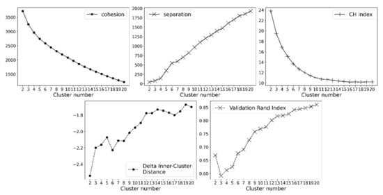 - For all the choices of K from 2 to 20 (increment by 1), the same K-means clustering experiment was performed 20 times, and the average cohesion, separation, Calinski–Harabasz (CH) index, delta inner-cluster distance, and validation Rand index over the 20 experiments were recorded. A desirable K was selected based on the metrics.