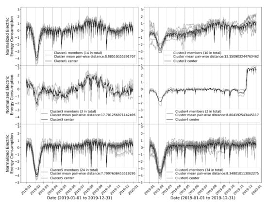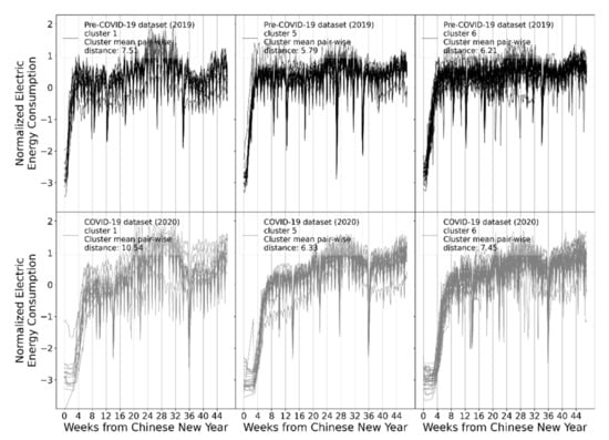 - Secondly, the cluster mean pairwise distance difference between the two periods became smaller after week #5. This indicates that the electricity consumption pattern in the COVID-19 period started to resume to normal levels around this time, which was the end of February 2020. It coincides with the governmental policies of the Zhejiang Province, allowing the resumption of work and production at the end of February 2020 [37];