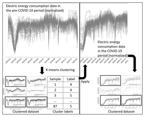 The first clustering analysis of the COVID-19 dataset was performed using the pre-impact clustering result, as explained previously in Section 3.8.1. The pre-impact clustering result in this study was the cluster labels obtained from the clustering of the pre-COVID-19 dataset. In addition, only the cluster labels of clusters 1, 5, and 6 were used because they were representative consumption profiles in the dataset. This process is schematically shown in Figure 8.
